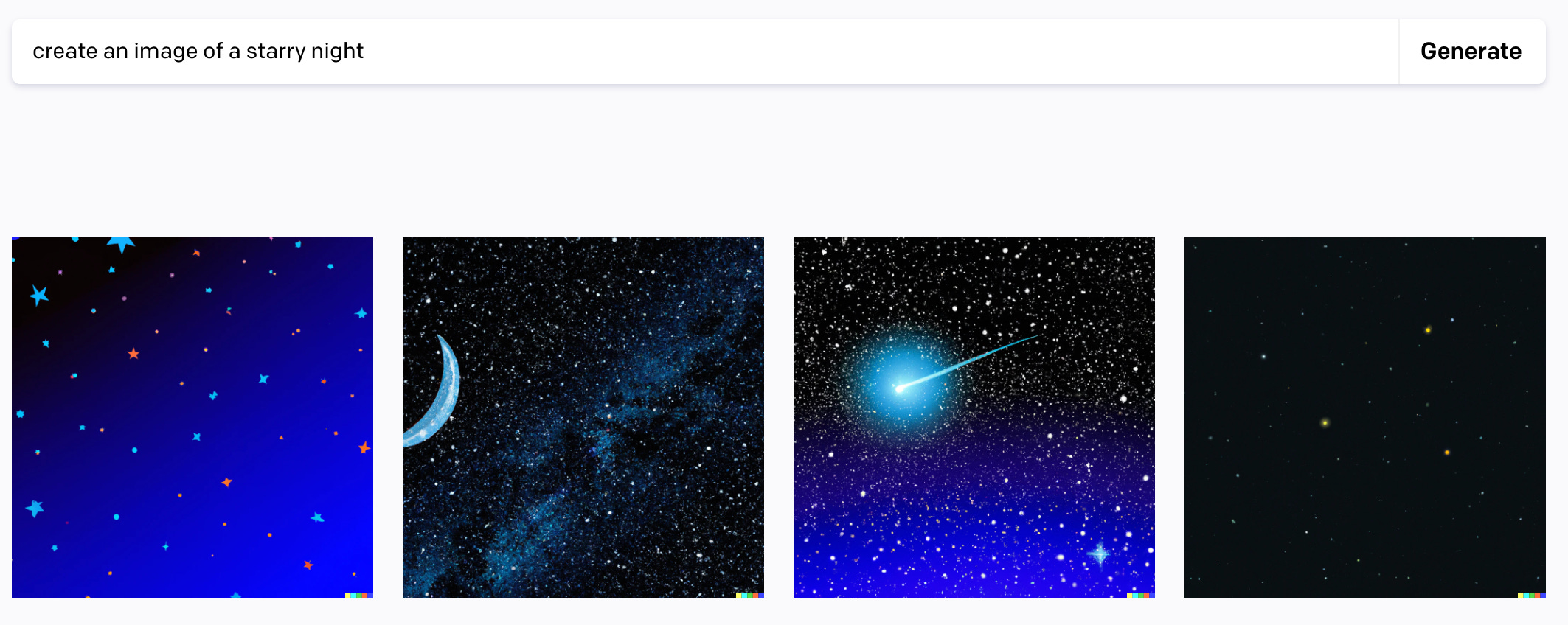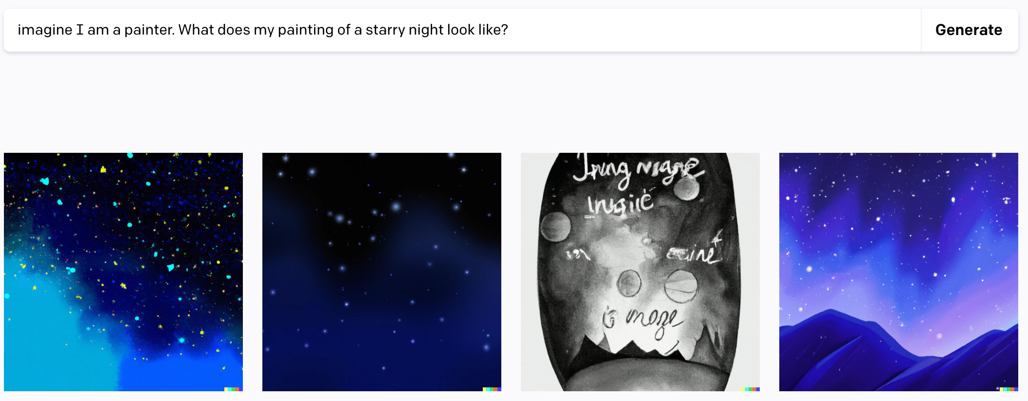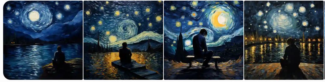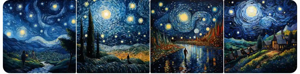 Apart from the obvious over-reliance on Van Gogh’s, The Starry Night, as training and reference point, what differences do you observe? (Like other image generators, Midjourney responds with four results to a given prompt.)